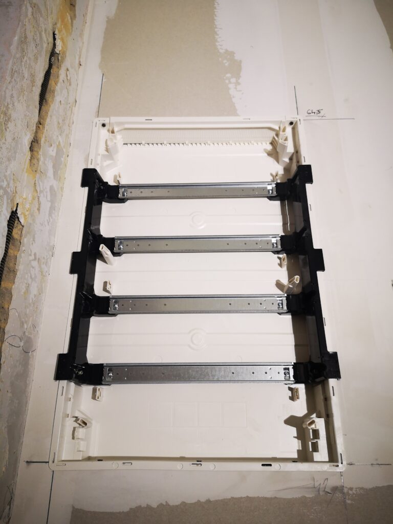 Típus alapján jobb eldönteni, hogy egy bizonyos szerelés esetén sülyesztett vagy falon kívüli elosztót használjunk. Számos előnnyel szolgálhat egy falonkívüli elosztó (Pragma, Plexo, Vector típus). Ezek a típusok sokkal szerethetőbbek szerelésnél és karbantartásnál. A másik oldalról persze van amikor elkerülhetetlen egy sülyesztett elosztó, mint amilyen a fenti képen látható – gipszkartonba szerelhető süllyesztett elosztó. Ezekből is vannak természetesen olyan típusok amikbe könnyű szerelni, használható a sínek mögötti rész vezeték/kábel elvezetésre.